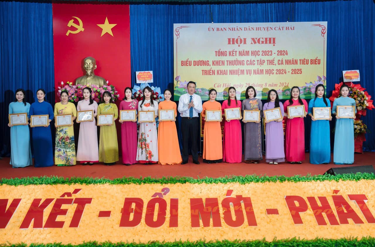 - Tập thể nhà trường đạt tập thể Lao động tiên tiến được nhận Giấy khen của Giám đốc Sở Giáo dục và đào tạo - Cô giáo Nguyễn Thị Thu Hương - Giáo viên dạy lớp 3 tuổi được UBND huyện Cát Hải tặng Giấy khen đã có thành tích xuất sắc trong năm học 2023-2024.