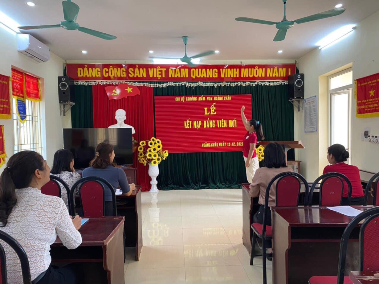 Ngày 12/12/2023, Chi bộ Trường Mầm non Hoàng Châu tổ chức Lễ kết nạp đảng viên mới cho quần chúng Trần Thị Sáng